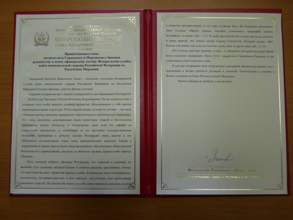 «Уважаемый Виталий Николаевич Разин — начальник отделения Федеральной службы войск национальной гвардии Российской Федерации по Республике Мордовия! Господа офицеры, дорогие братья и сестры!