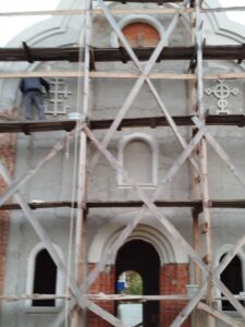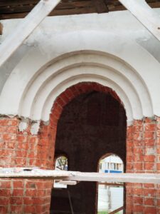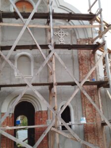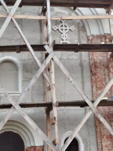 На уходящей неделе в строящемся Спасском храме г. Саранска начали штукатурить западную стену. На северной стороне появились закладные кресты, выполненные в новгородском и псковском стилях древнерусского зодчества.