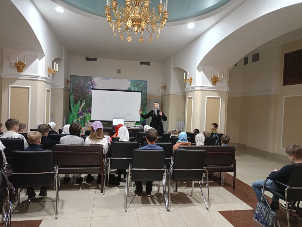 На уроке церковного пения Евгения Валерьевна Долинова и Марина Николаевна Вдовина рассказали о житии Архангела Михаила. Накануне приход молитвенно встретил праздник в честь Собора Архистратига Михаила и прочих Небесных Сил бесплотных. Ребята разучили и исполнили песню «У тебя есть Ангел Божий». Следующим этапом урока стало исполнение песни «Вот красота».