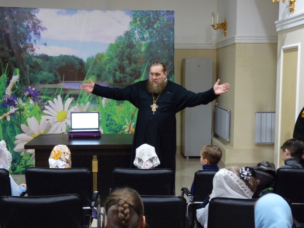 Вначале настоятель храма протоиерей Иоанн Просвирнин рассказал детям о правилах поведения за Божественной литургией. Дети не должны отвлекаться от молитвы, шуметь и бегать по храму. Спаситель принес Себя в Жертву ради нас. И мы, находясь на богослужении, предстоим рядом со Христом, поэтому недопустимо нарушать Таинство Святой Церкви.