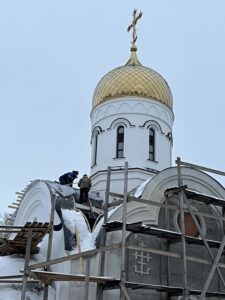 Сейчас на Спасском храме делают обрешетку под кровлю. Сначала была собрана стропильная система — металлическая конструкция, на которой будет держаться крыша. А вот обрешетка из сосновых досок поможет правильно распределить нагрузку. На последних фотографиях видно, как продвигаются кровельные работы.