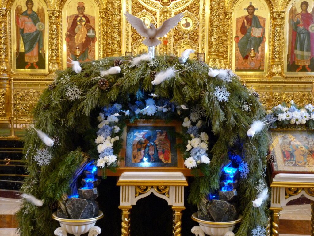 В храме святых равноапостольных Мефодия и Кирилла, учителей Словенских, г. Саранска необычно украсили аналой, на котором находится икона «Крещение Господне (Богоявление)». С обеих сторон слышится мягкое журчание воды. Это струятся ручьи. Они текут сверху вниз по камням, воссоздавая образ реки Иордан. А синяя подсветка придает особую атмосферу приближения праздника Крещения Господня. Над иконой парит белый голубь — видимый образ Святаго Духа. В Евангелии сказано: «Когда же крестился весь народ, и Иисус, крестившись, молился: отверзлось небо, и Дух Святый нисшел на Него в телесном виде, как голубь» (Лк. 3: 21). Каждый, кто подходит к иконе, на мгновение соприкасается с евангельской реальностью.