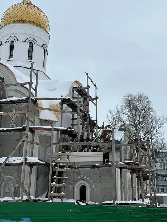 27 февраля рабочие приступили к установке стропильной системы над трапезной частью строящегося Спасского храма в Саранске. Ранее металлическую конструкцию собрали внутри самого храма, а теперь специалисты монтируют её на месте: выравнивают и укрепляют элементы наверху. Следующий этап работ — обшивка стропильной системы досками и двойным слоем фанеры.