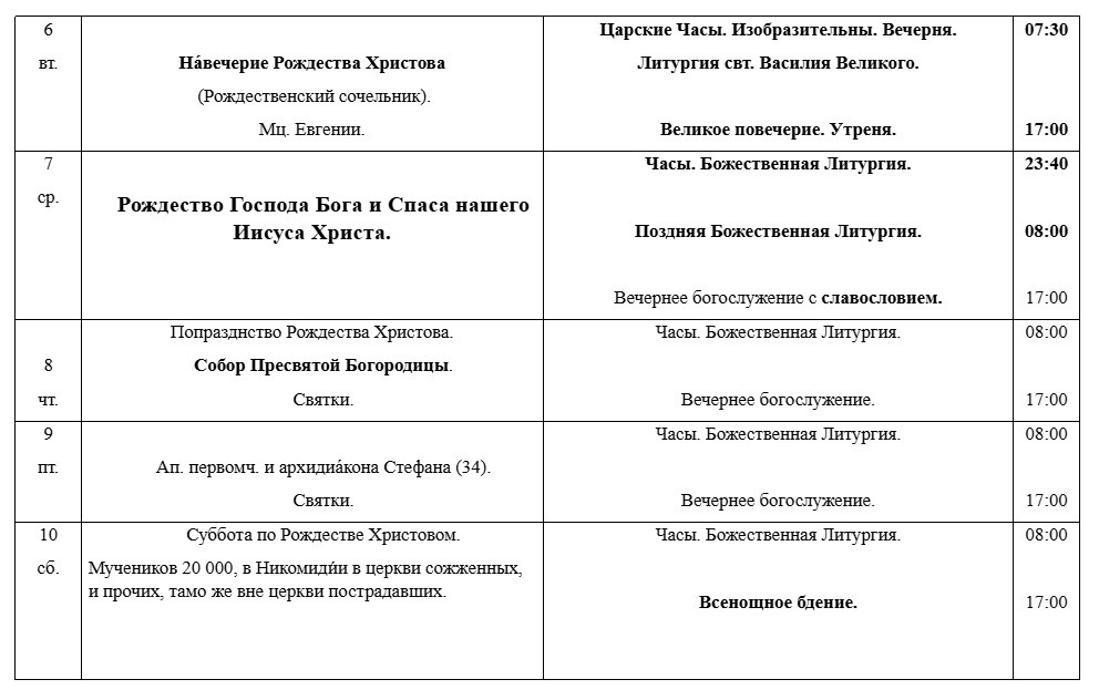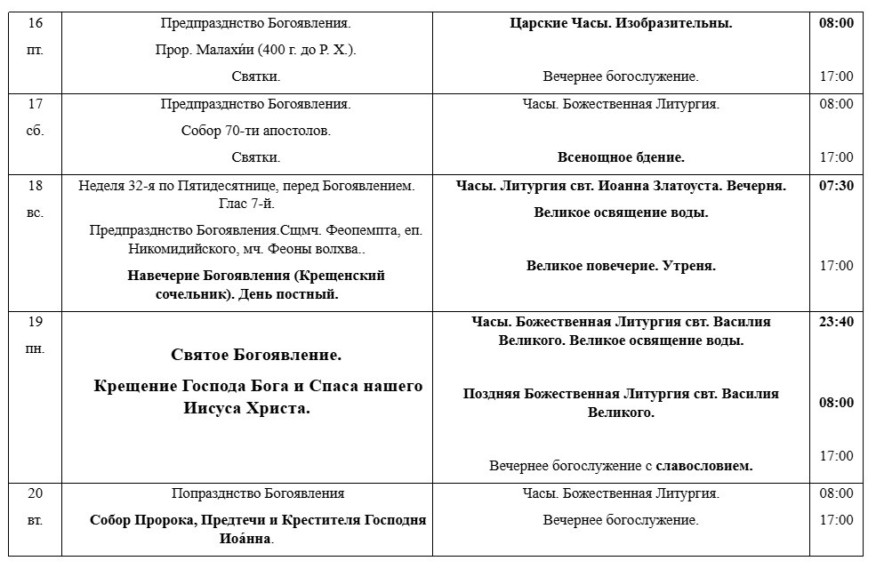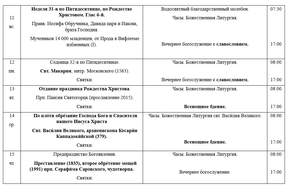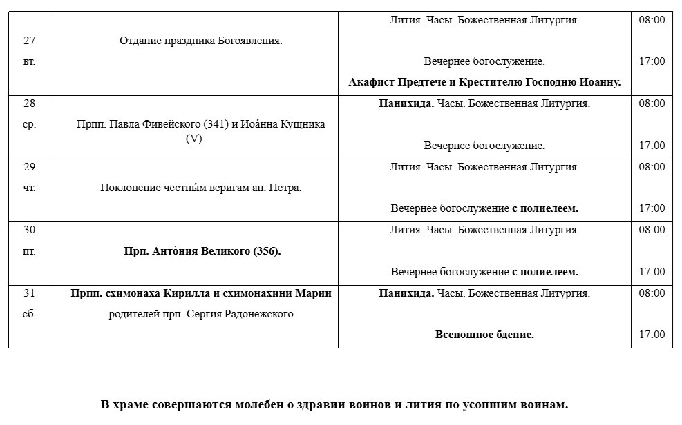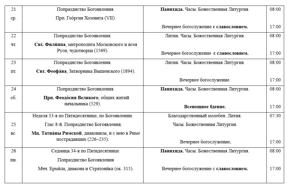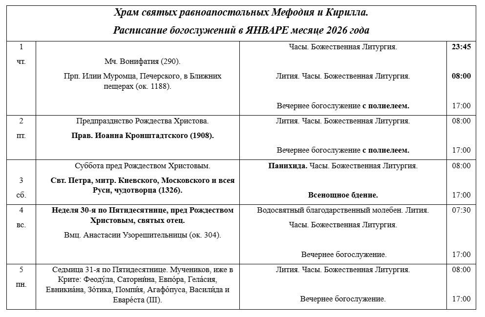 РАСПИСАНИЕ БОГОСЛУЖЕНИЙ В ЯНВАРЕ