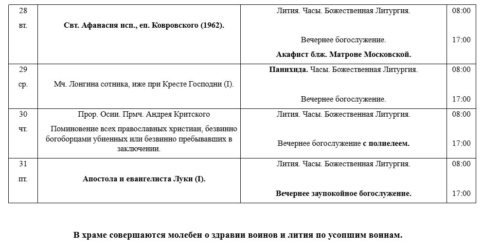 РАСПИСАНИЕ БОГОСЛУЖЕНИЙ В НОЯБРЕ
